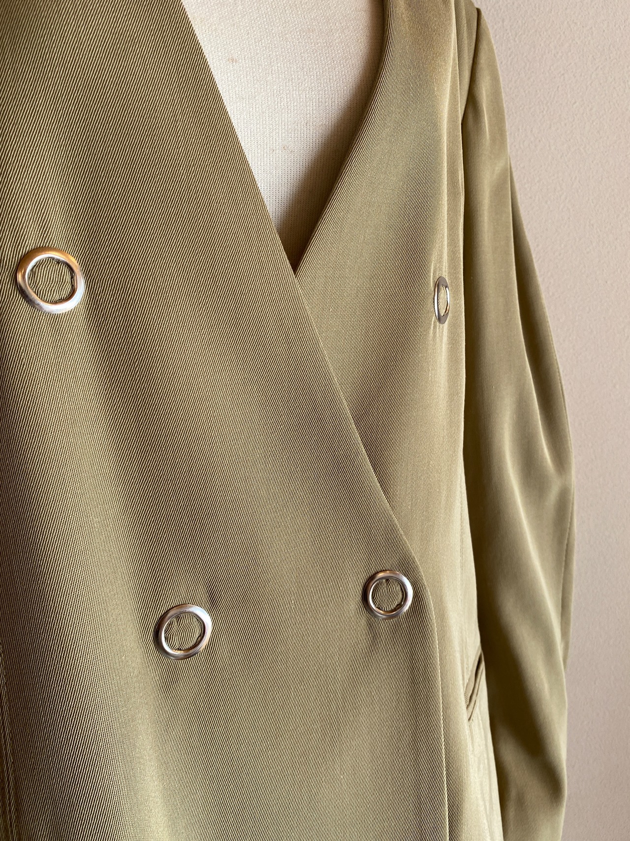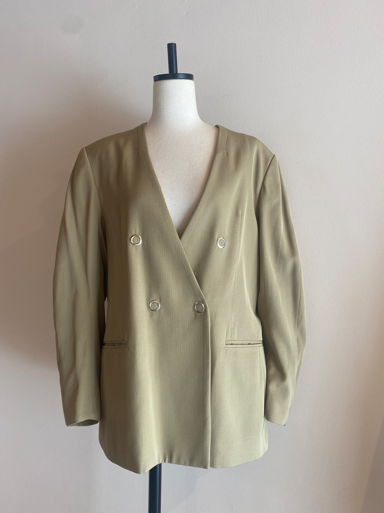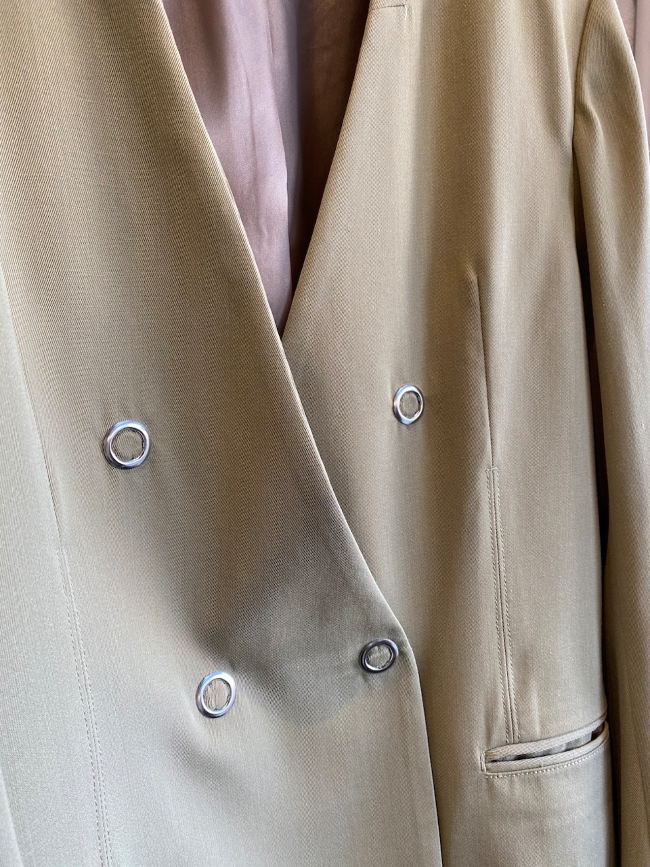 ダブルボタンで存分にヴィンテージの雰囲気をふりかけながらも、ノーカラーで現代に落とし込みやすいジャケットです。