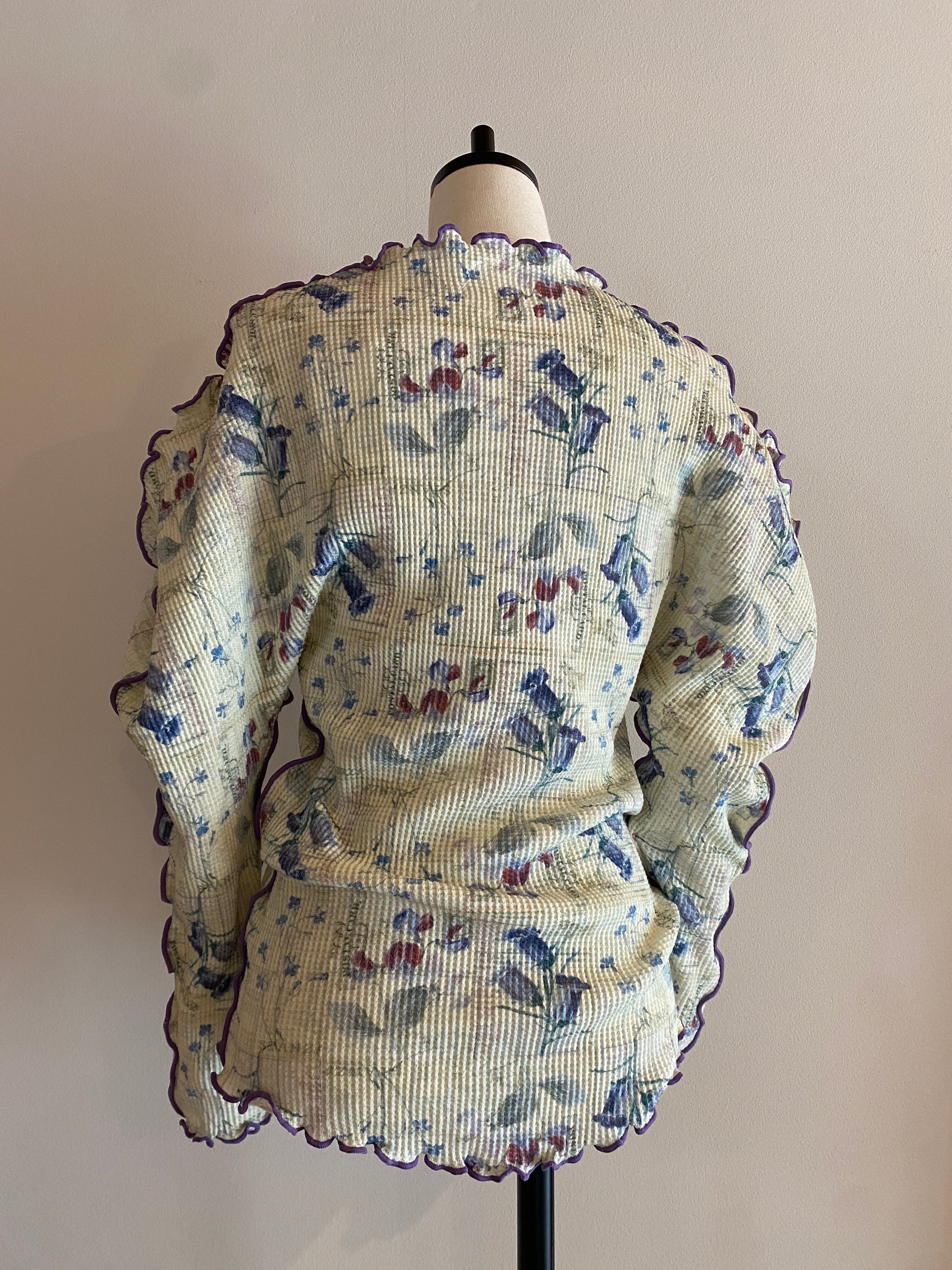 やさしいタッチのアンティークフラワーにみずみずしいパープルのパイピングが踊ります。